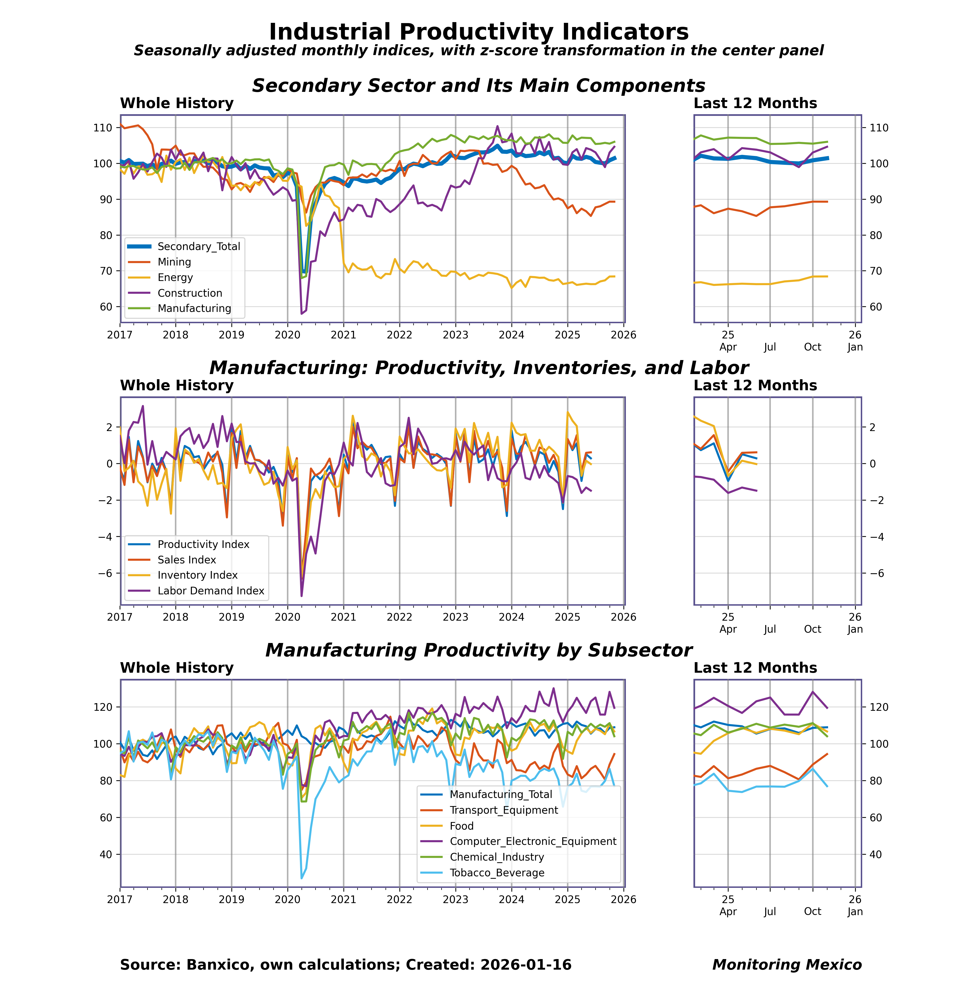 Productivity trends reveal the economy's capacity to grow without stoking inflation. In Mexico, productivity in the secondary sector — mining, energy, construction, and especially manufacturing — signals how efficiently output expands relative to inputs. Strong productivity gains mean firms can meet demand without raising prices, easing inflation pressure and supporting sustainable wage growth. Weak productivity, by contrast, constrains supply, making cost shocks more inflationary. Manufacturing deserves closer scrutiny, as its diverse subsectors respond differently to global demand, exchange rate shifts, and investment cycles. Tracking these patterns helps judge whether growth is supported by efficiency gains or reliant on credit and labor cost increases.