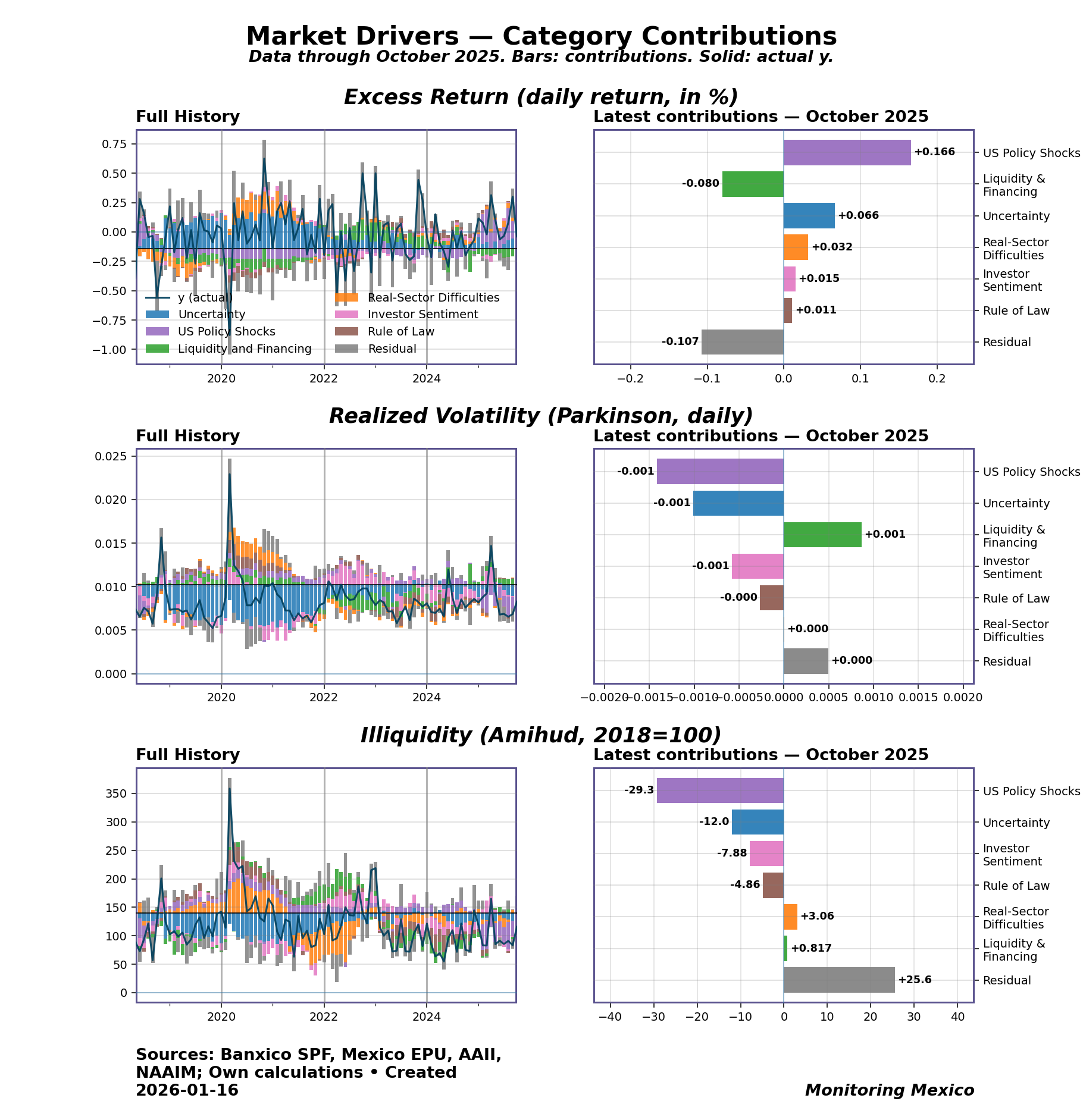 The decomposition shows that recent volatility has been primarily influenced by US policy shocks and prevailing uncertainty. Top contributors to the recent shifts include US policy shocks and liquidity challenges, which are reinforcing a cautious market environment. Notably, uncertainty remains a persistent factor, continuously affecting market dynamics and investor confidence. These drivers signal a complex interplay between external influences and domestic market responses.
