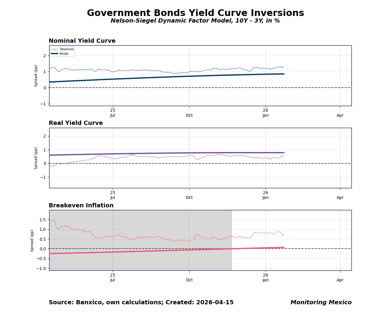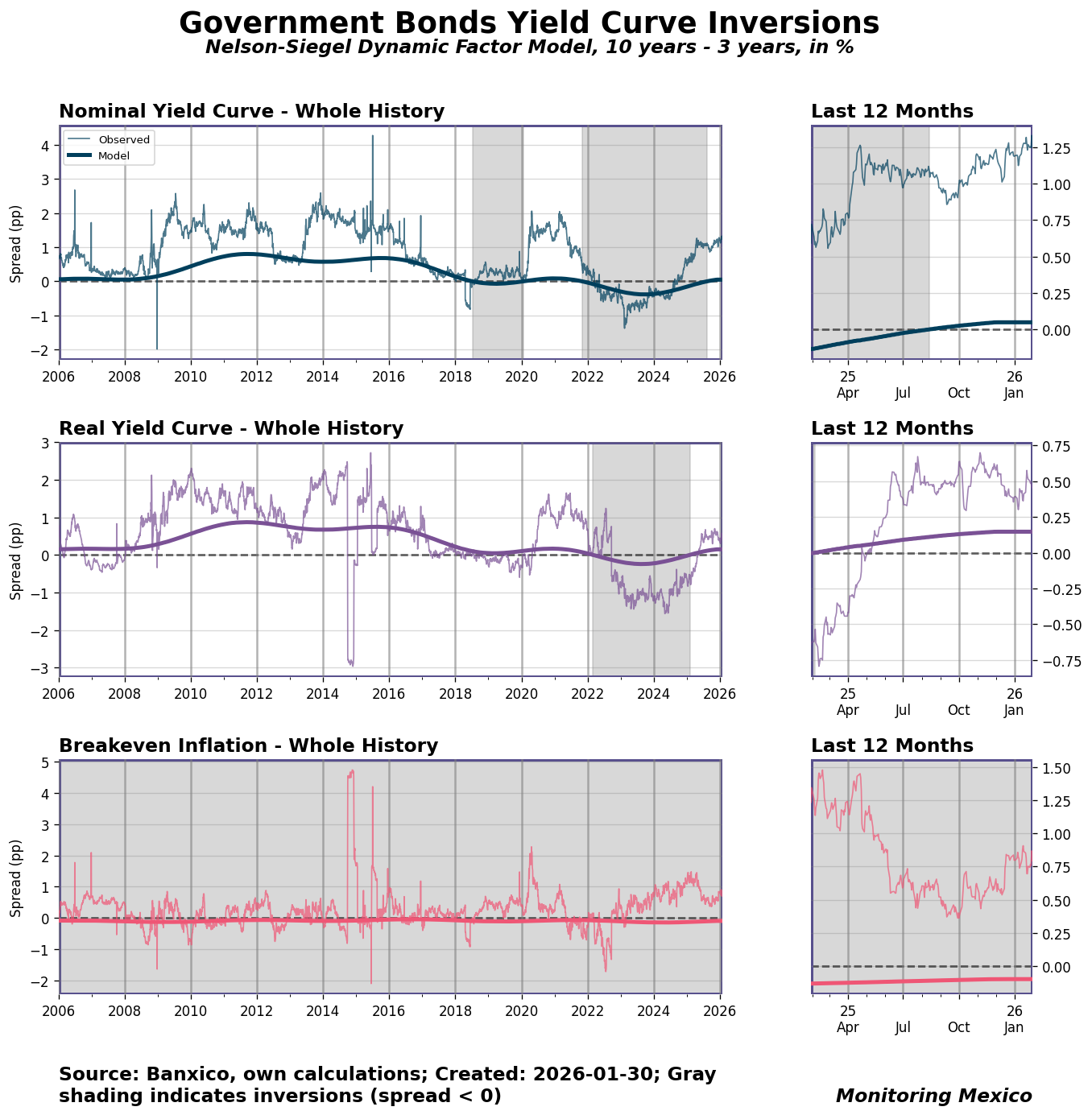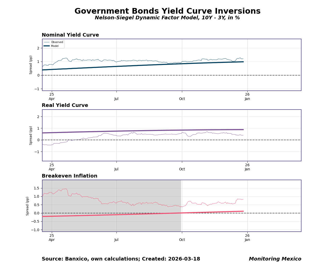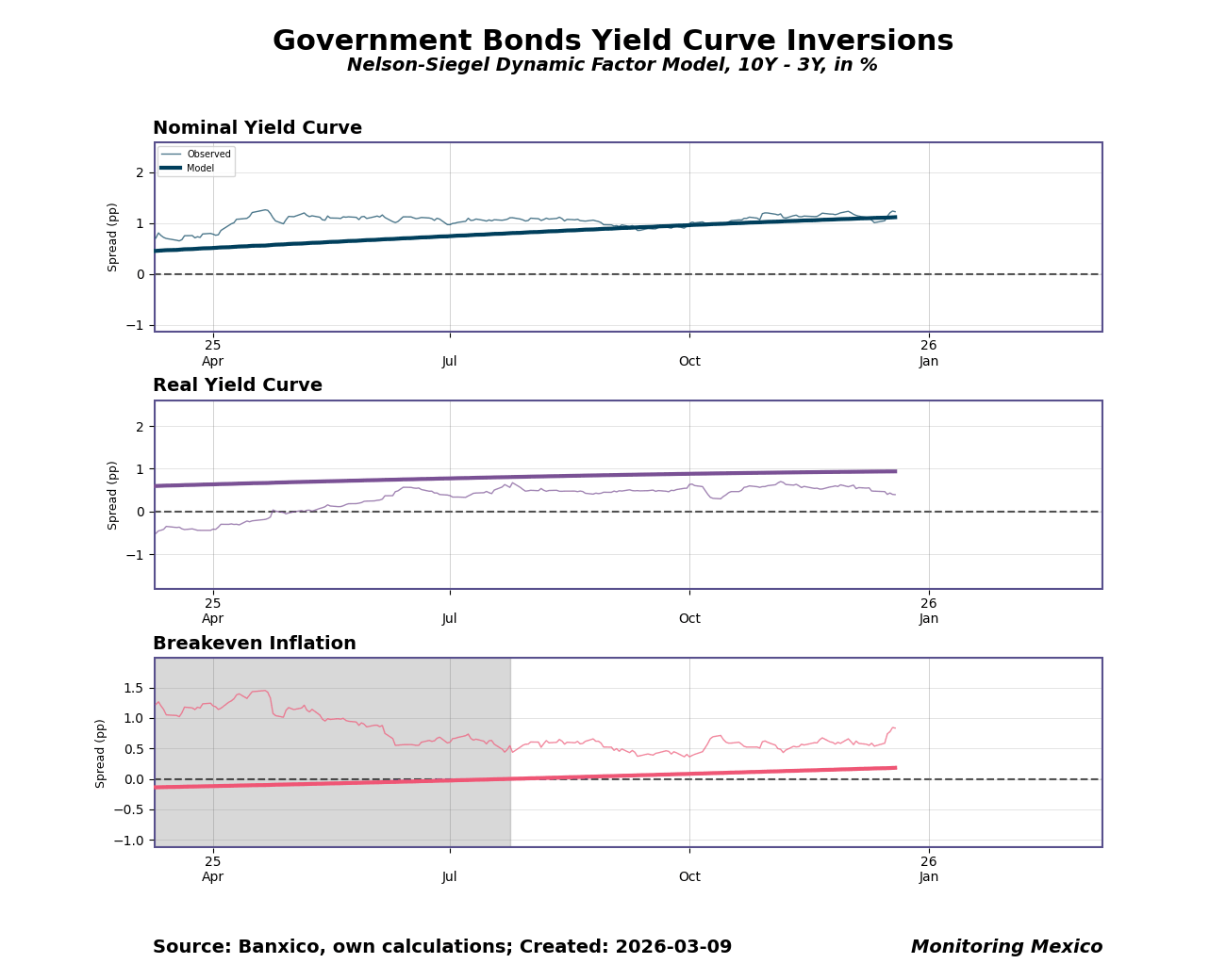 When investors and businesses trust that monetary policy will remain credible and predictable, long-term interest rates respond more smoothly to central bank signals. Yield curve spreads between long and short maturities serve as a real-time gauge of this alignment: a stable, upward-sloping curve suggests markets expect gradual normalization, while persistent inversions often signal that markets anticipate policy shifts before they are announced. For Mexico, where inflation targeting depends on anchoring expectations across a diverse investor base, the 10-year minus 3-year spread offers a compact summary of whether policy communication is landing as intended.