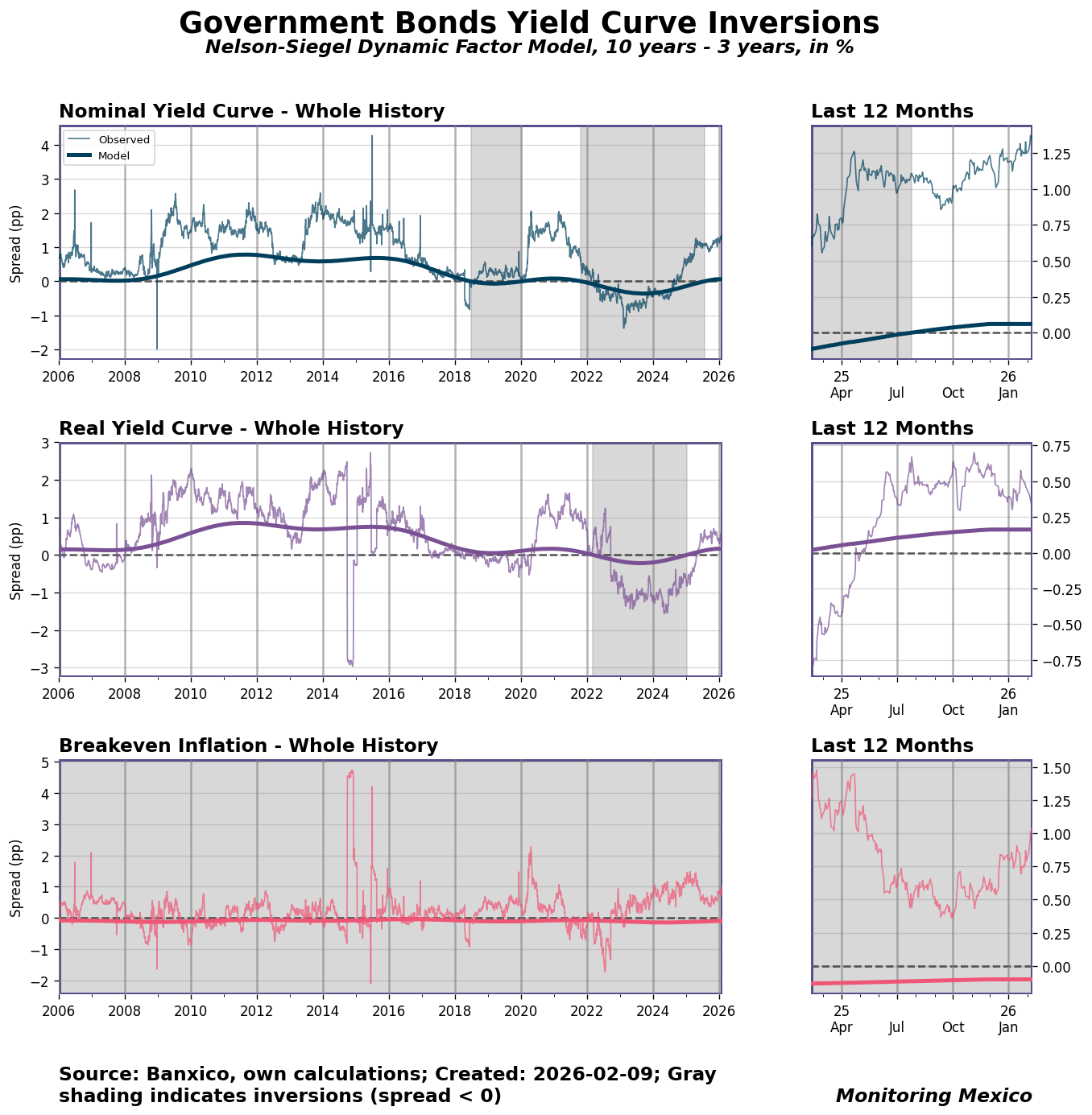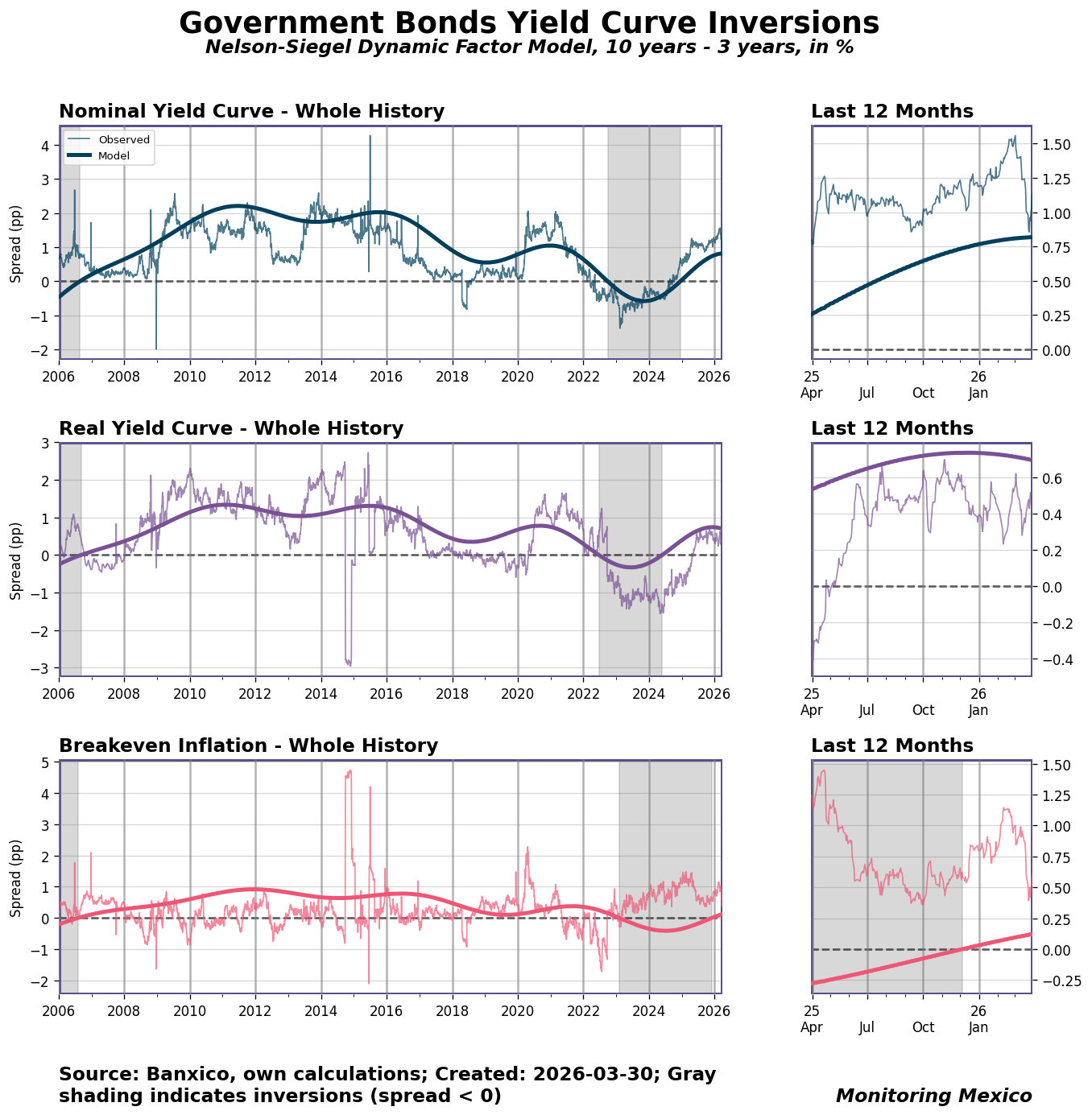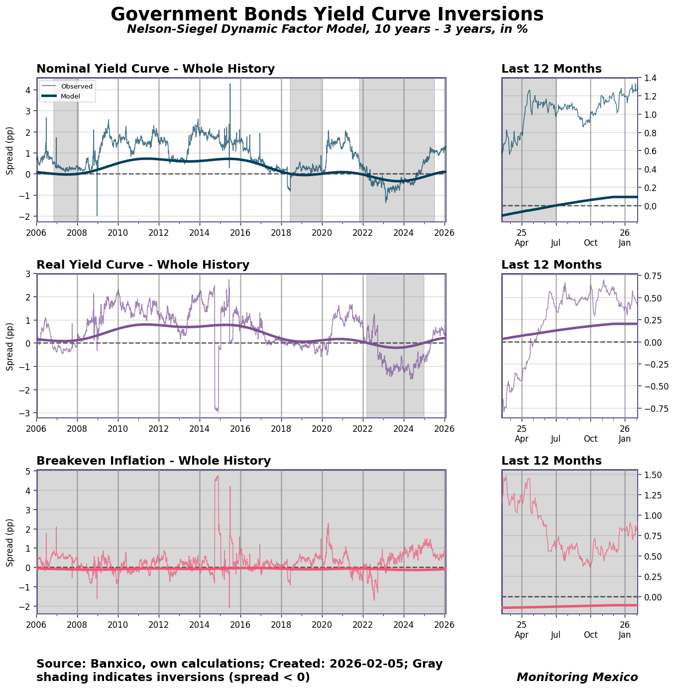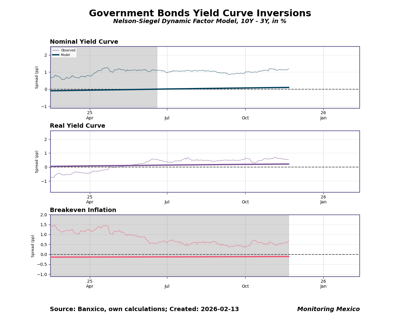 When investors and businesses trust that monetary policy will remain credible and predictable, long-term interest rates respond more smoothly to central bank signals. Yield curve spreads between long and short maturities serve as a real-time gauge of this alignment: a stable, upward-sloping curve suggests markets expect gradual normalization, while persistent inversions often signal that markets anticipate policy shifts before they are announced. For Mexico, where inflation targeting depends on anchoring expectations across a diverse investor base, the 10-year minus 3-year spread offers a compact summary of whether policy communication is landing as intended.