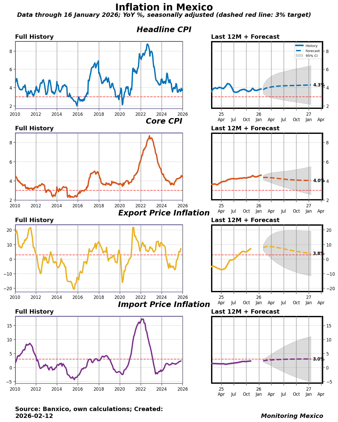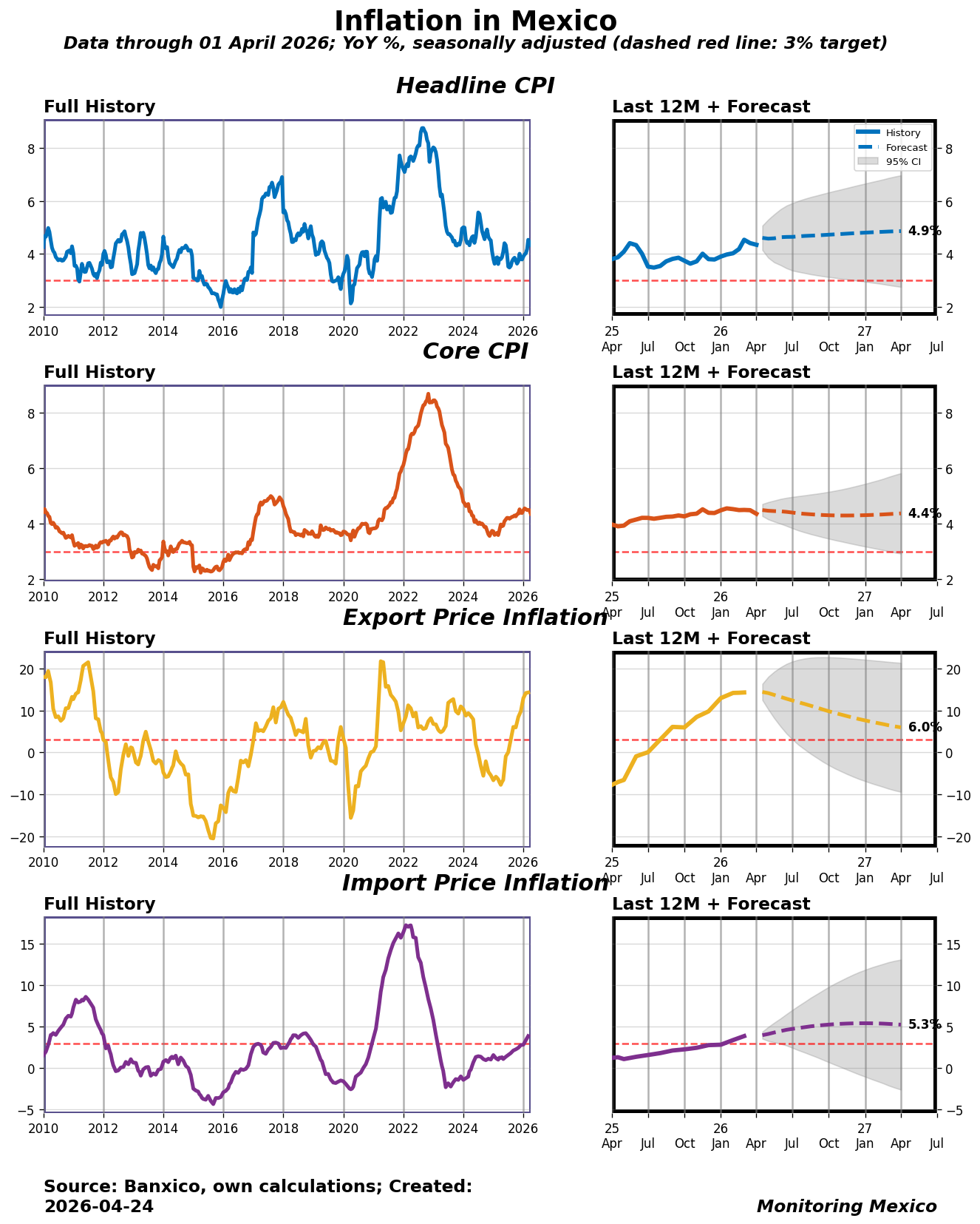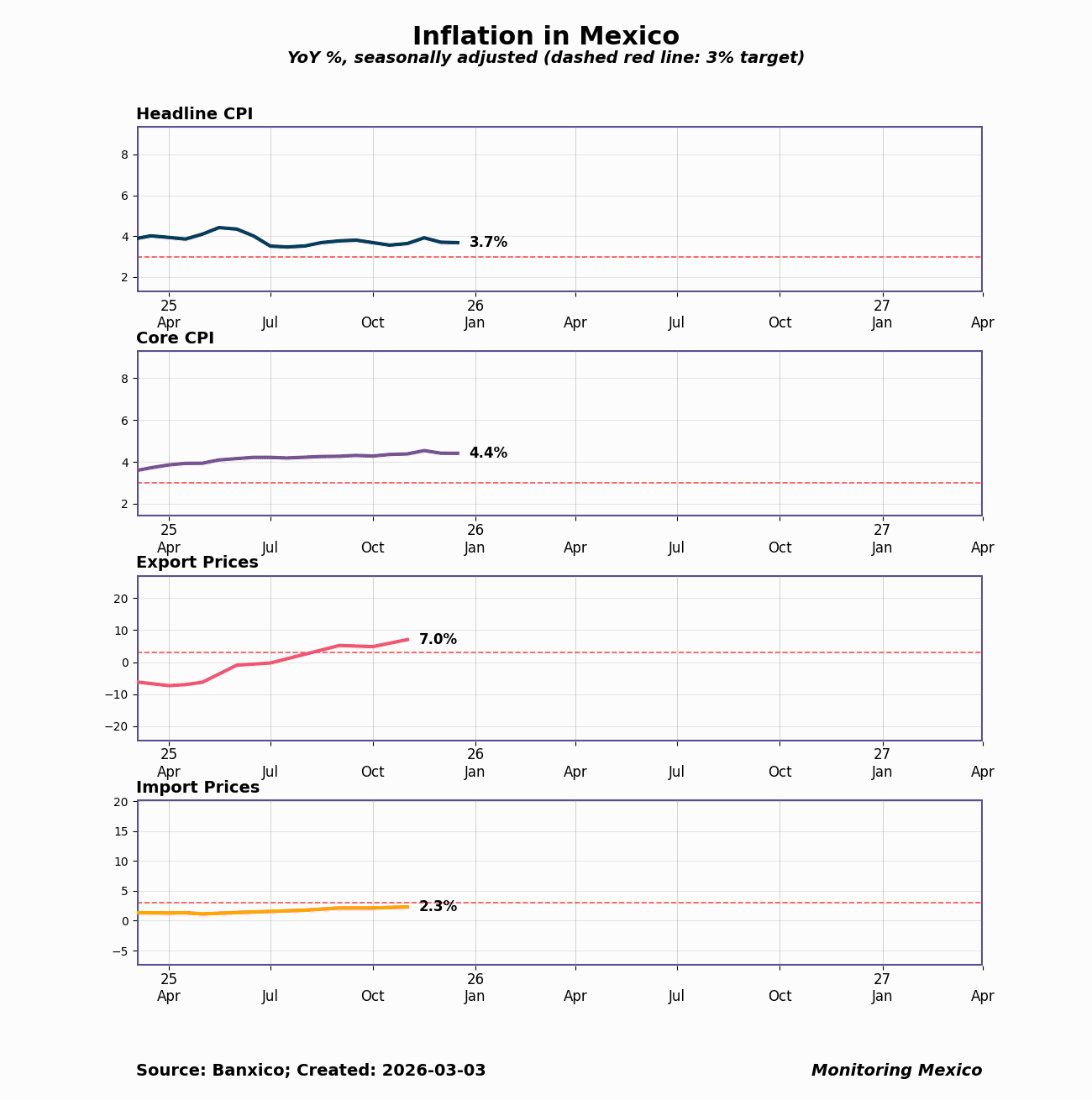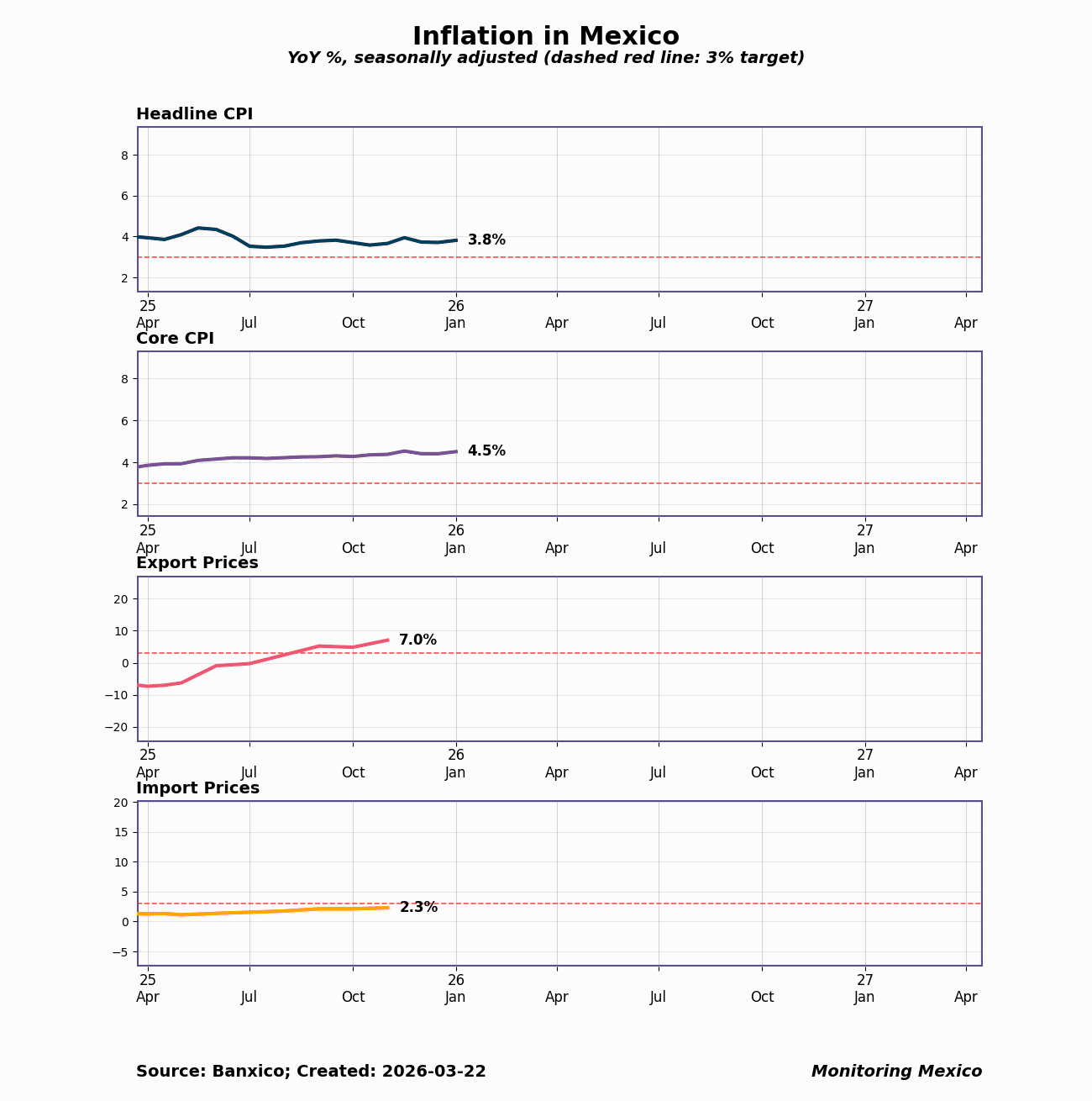 The Consumer Price Index (CPI) measures changes in the cost of a representative basket of goods and services purchased by Mexican households. Banxico targets 3% annual inflation with a tolerance band of 2%-4%. Core CPI — which excludes volatile food and energy prices — reveals underlying inflation trends that guide monetary policy. Import and export price indices extend the picture by linking Mexico's inflation dynamics to global markets, trade flows, and currency movements.