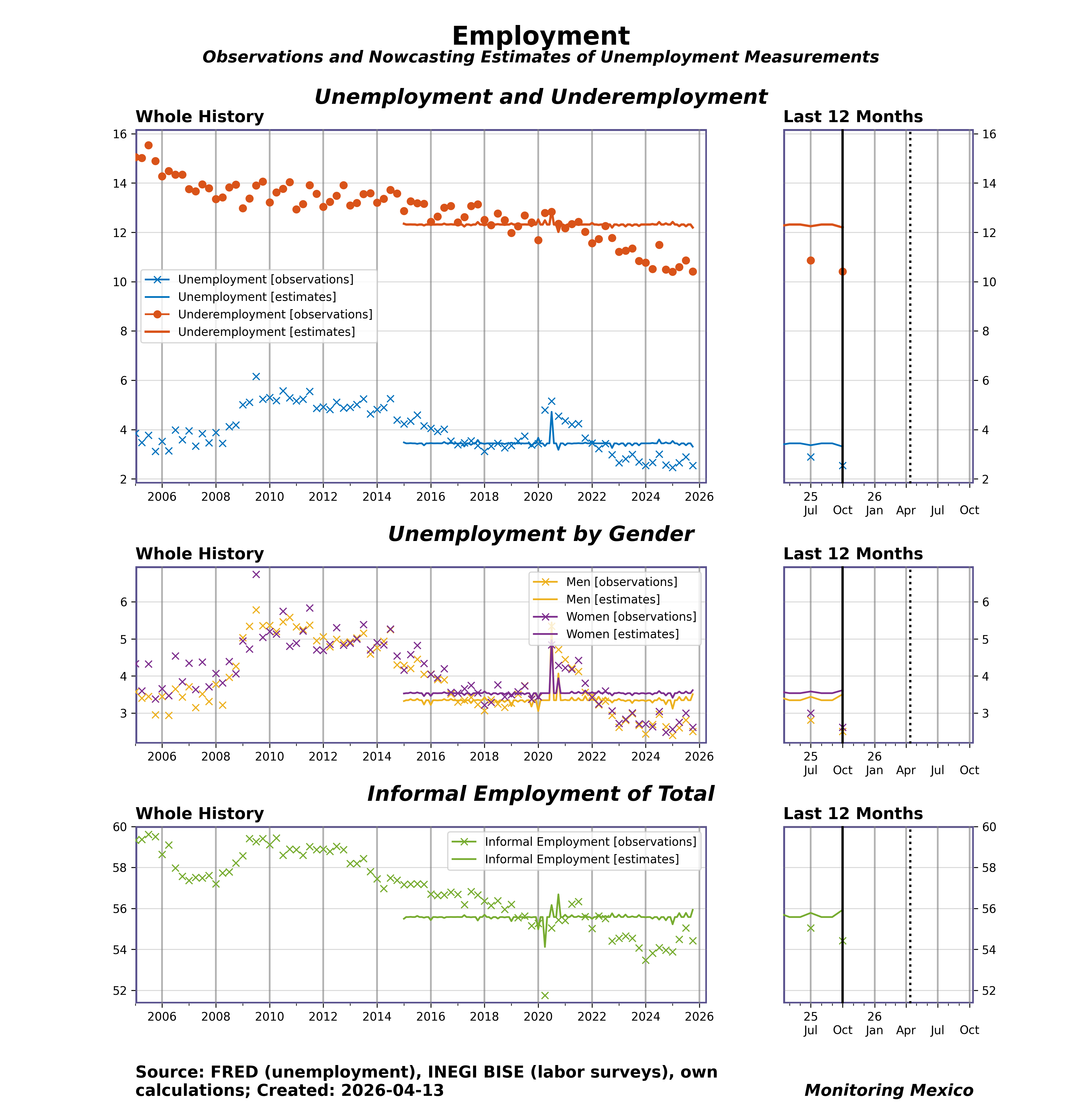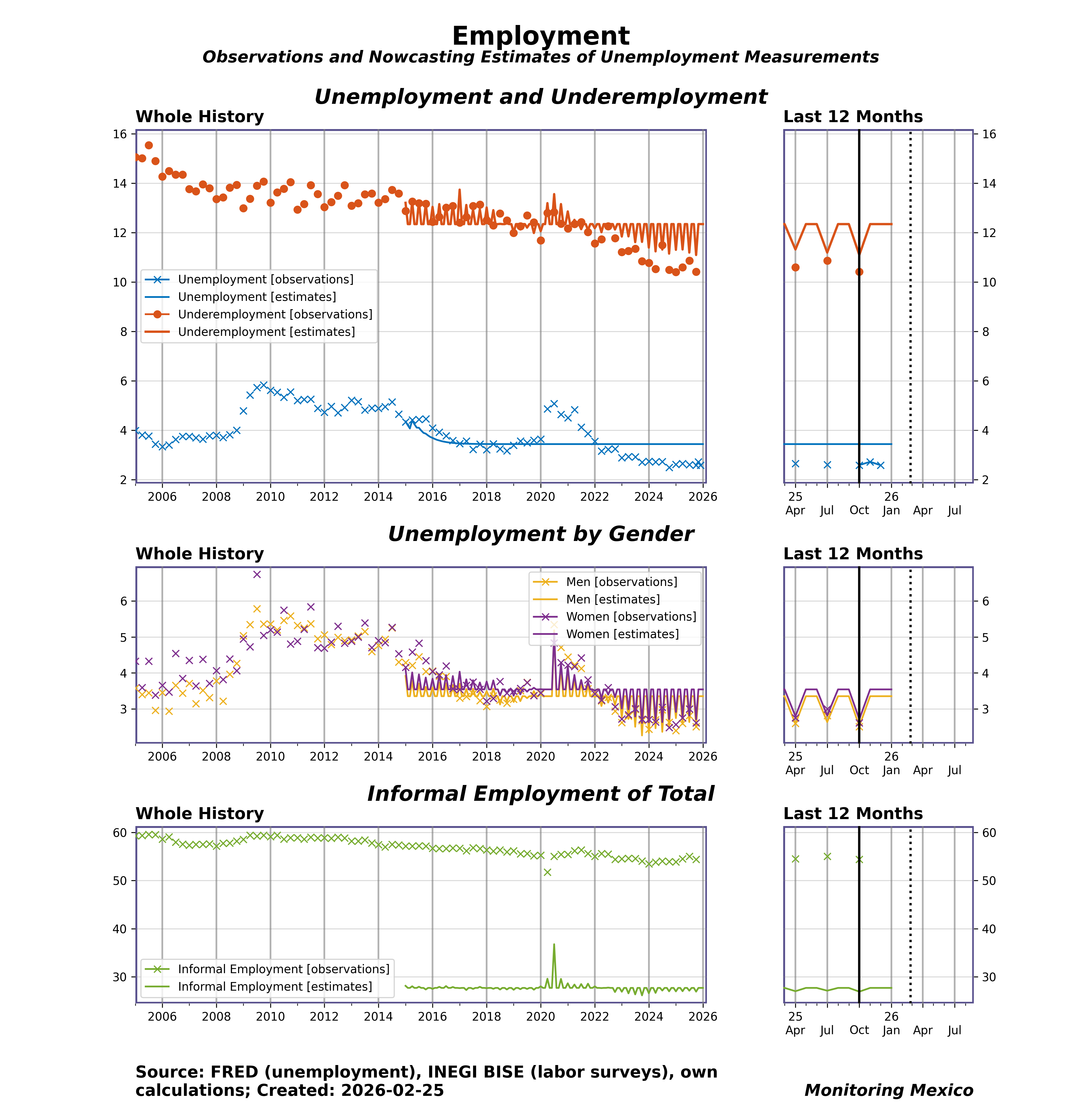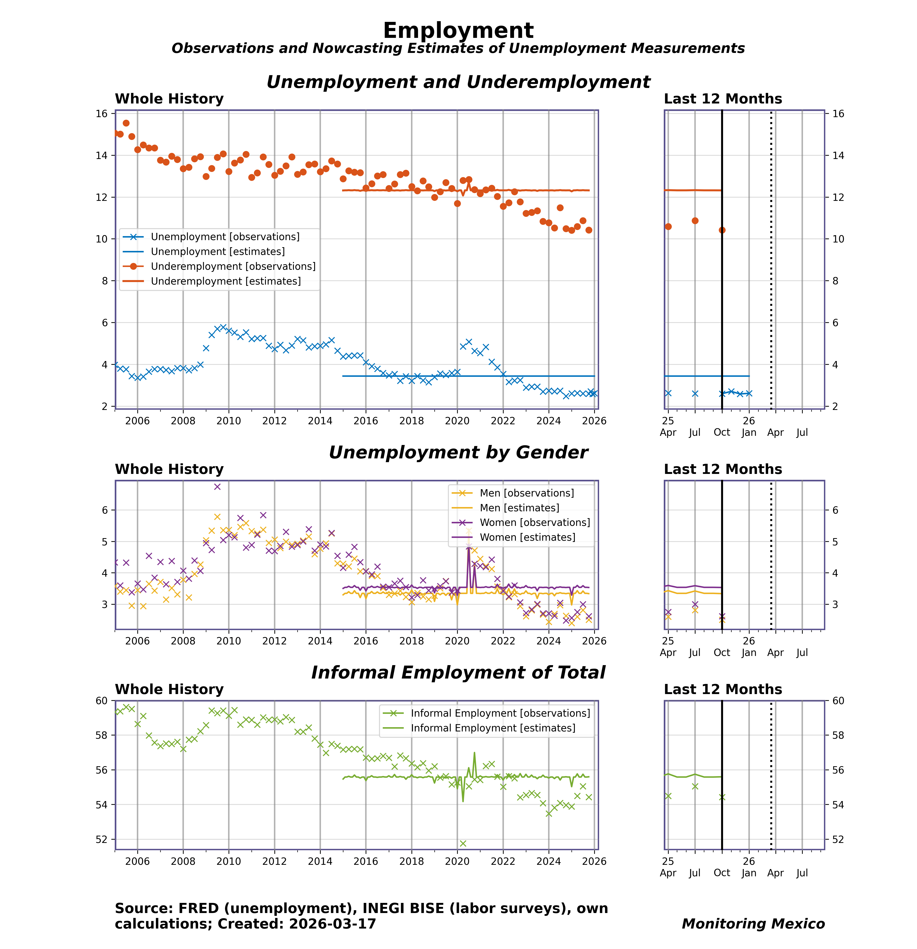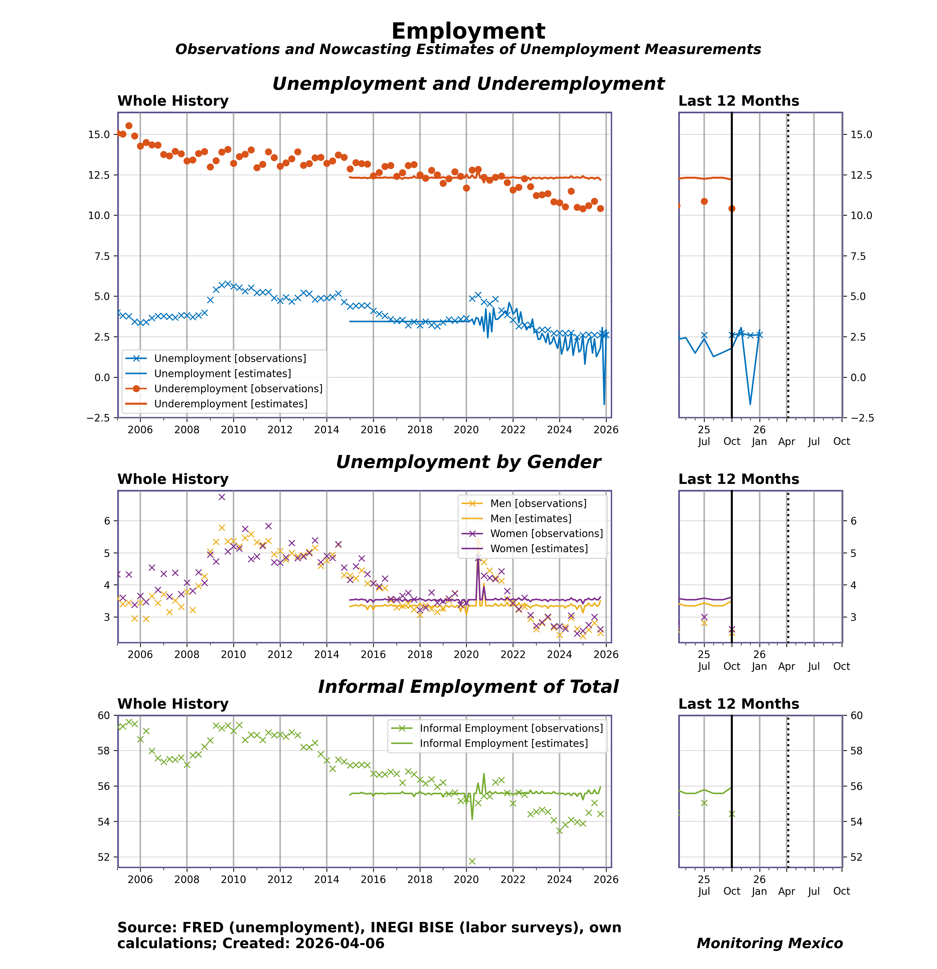 Labor slack and its composition shape inflation pressure, policy timing, and social risk. Unemployment, underemployment, and unemployment by gender reveal how broad and uneven slack is. In Mexico's large informal sector, the informal employment share can swing sharply — often contracting faster in downturns as unprotected jobs are cut first, then rebounding early — masking true slack if headline unemployment alone is tracked. Tracking these dimensions helps distinguish cyclical slack from structural mismatches and calibrate monetary policy accordingly.