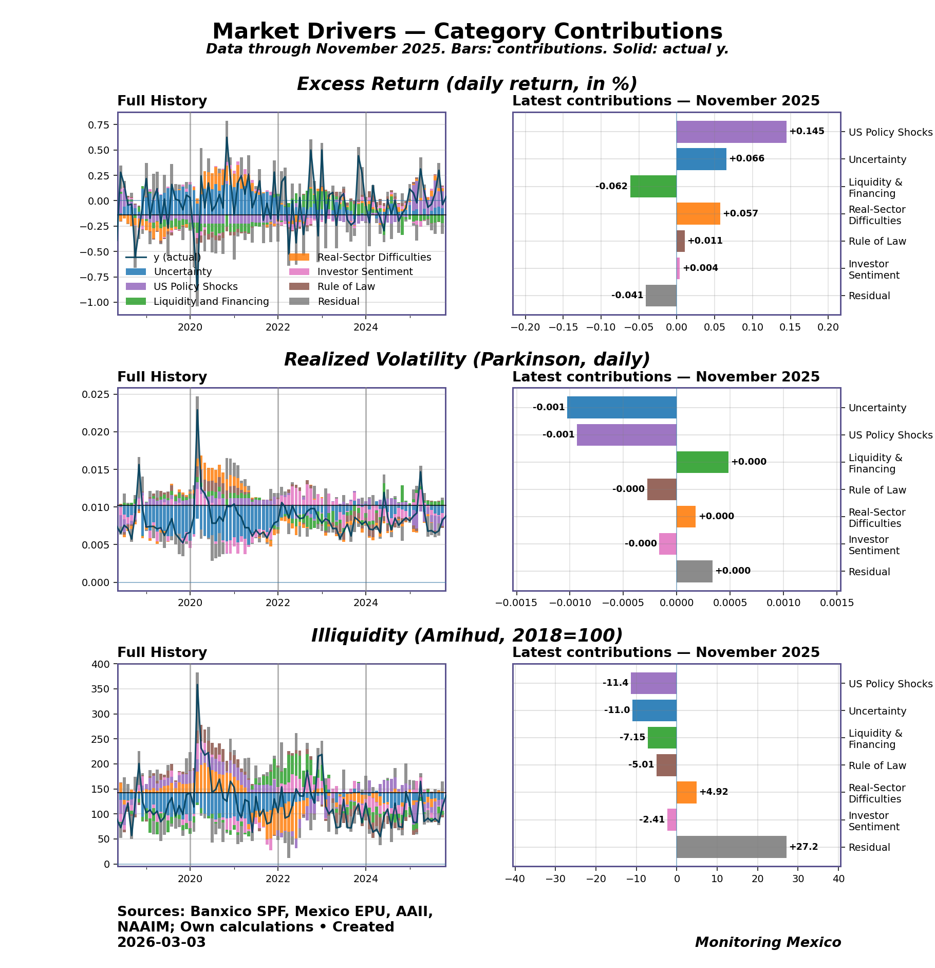 Mexican equity markets as of March 4, 2026, show excess returns at 0.0408, reflecting a modest increase amidst prevailing uncertainties. With data through March 4, 2026, Mexican equity markets exhibit excess returns at 0.0408, while realized volatility has registered at 0.0088. Notably, the illiquidity measure, as gauged by the Amihud index, has risen to 137.45, underscoring a tightening financial environment. This uptick in illiquidity, alongside the recent fluctuations in the MXN/USD exchange rate, indicates a potential shift in market dynamics that may warrant closer scrutiny.