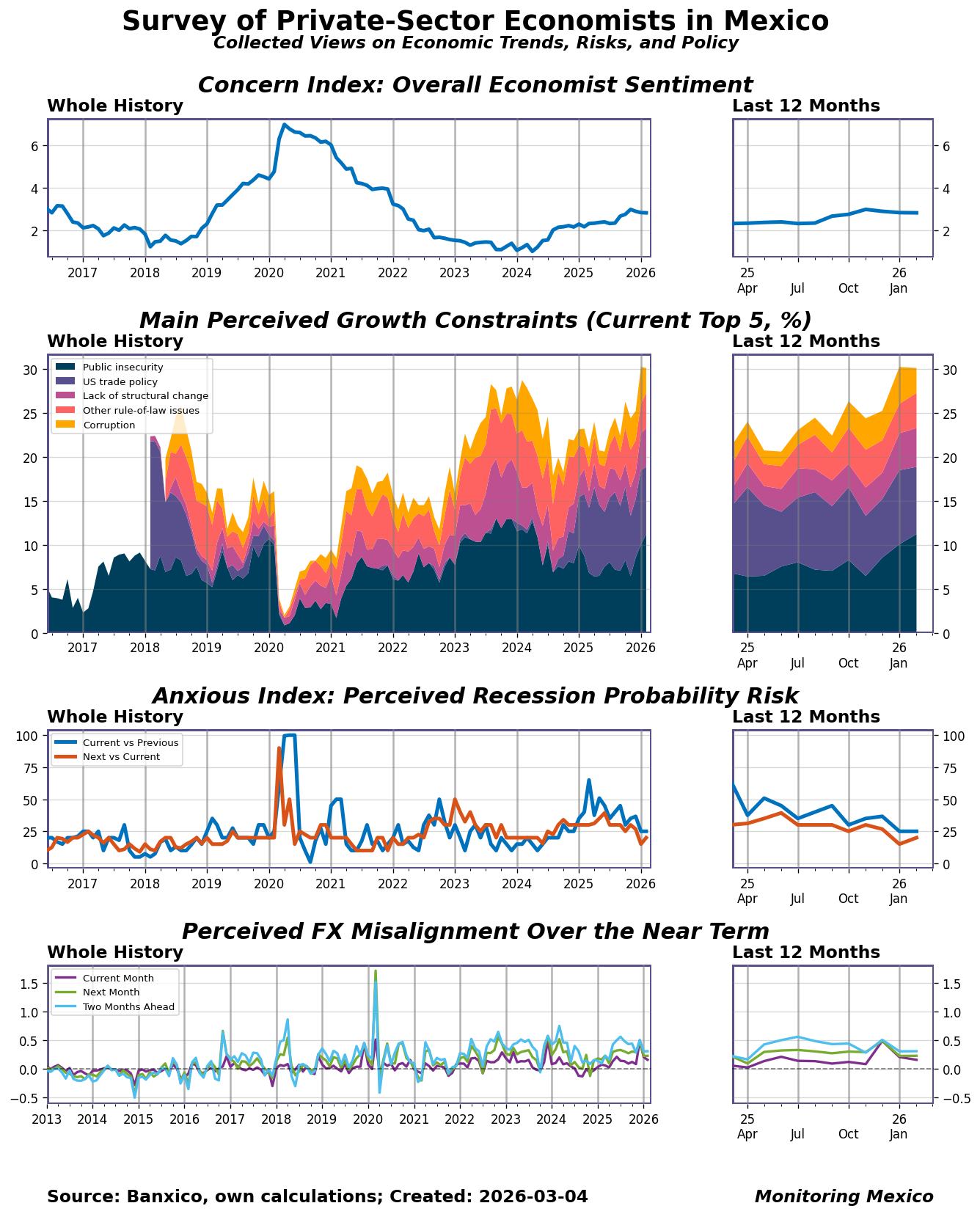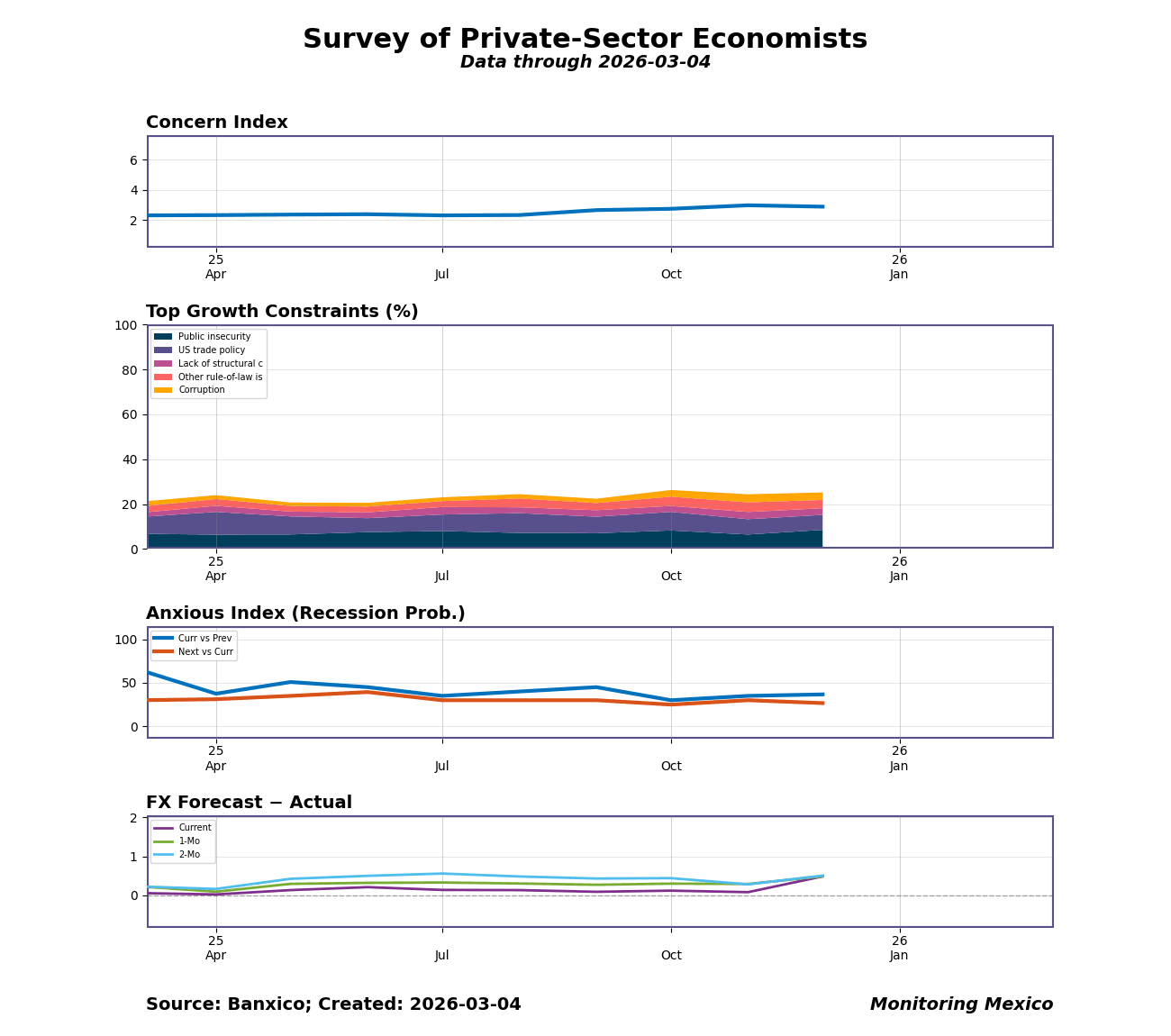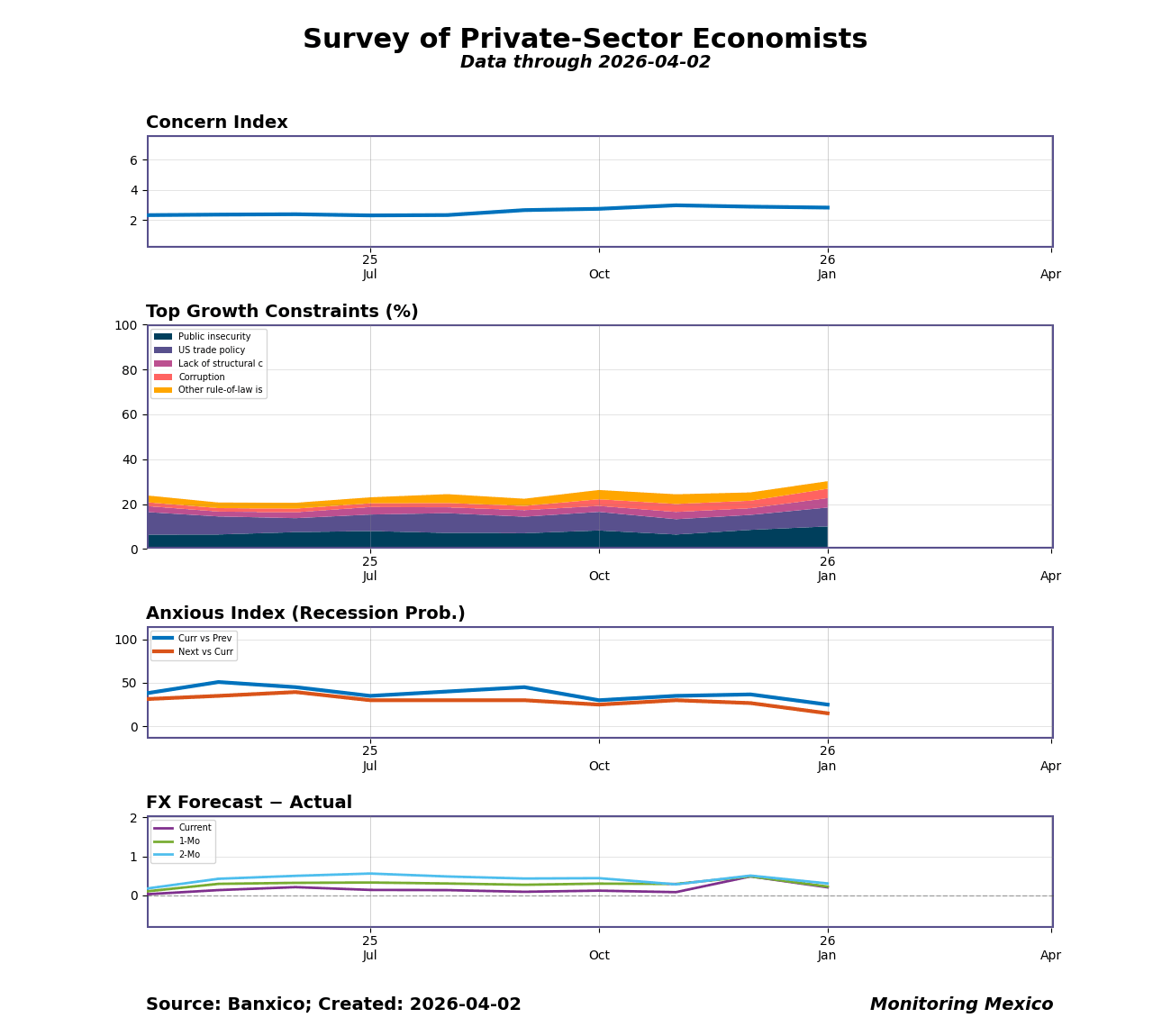 Banxico's Survey of Professional Forecasters (Encuesta sobre las Expectativas de los Especialistas en Economía del Sector Privado) polls roughly 40 groups of analysts from banks, financial institutions, consultancies, and research centers. Responses are collected during the second half of each reference month — typically between the 15th and 28th — and results are published on the first business day of the following month. Because respondents form their expectations before some end-of-month official data releases, the survey provides an early window into shifting professional sentiment on inflation, growth constraints, recession risk, and exchange rates, making it a valuable leading indicator for policymakers and market participants.