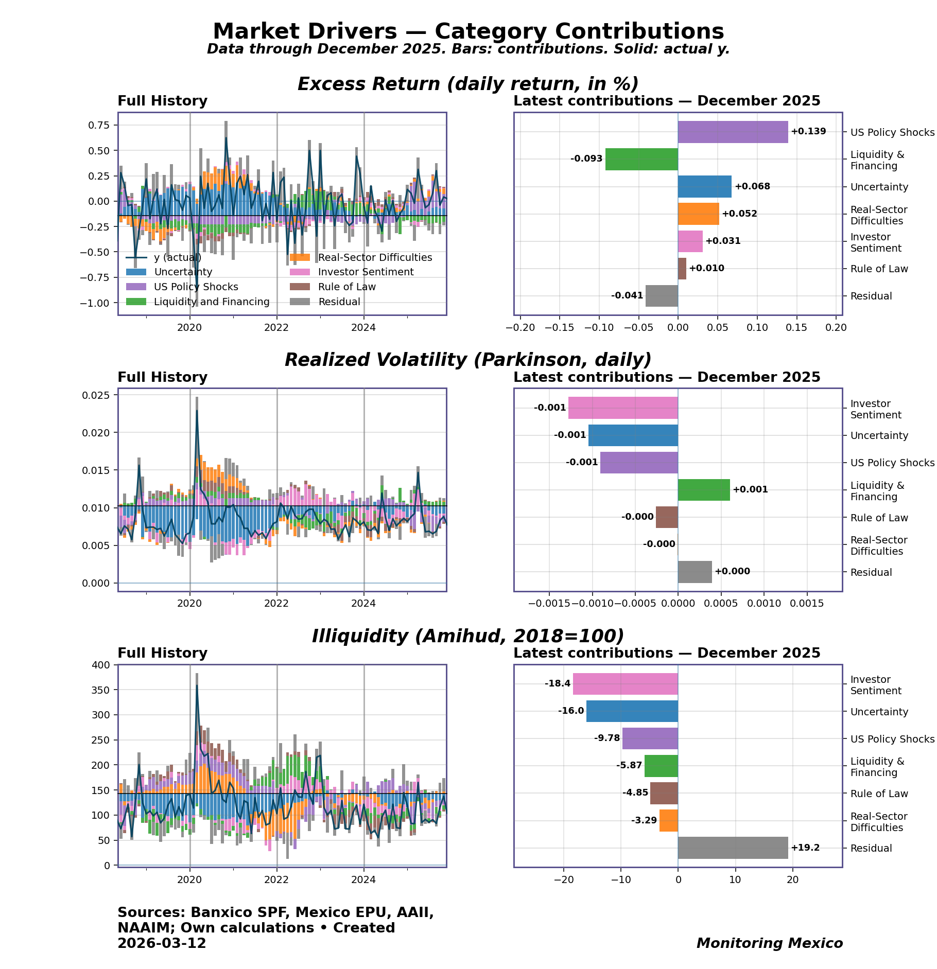 Mexican equity markets as of December 2025 show excess returns at 0.0254, reflecting a slight decline amid a backdrop of uncertainty. With data through December 2025, realized volatility stands at 0.0077, capturing a modest dip over the month. Illiquidity has also softened, but not enough to substantially shift the narrative. Recent movements have been relatively stable, indicating a market that’s absorbing various shocks but remains on edge as it anticipates Banxico's upcoming decision on March 26.
