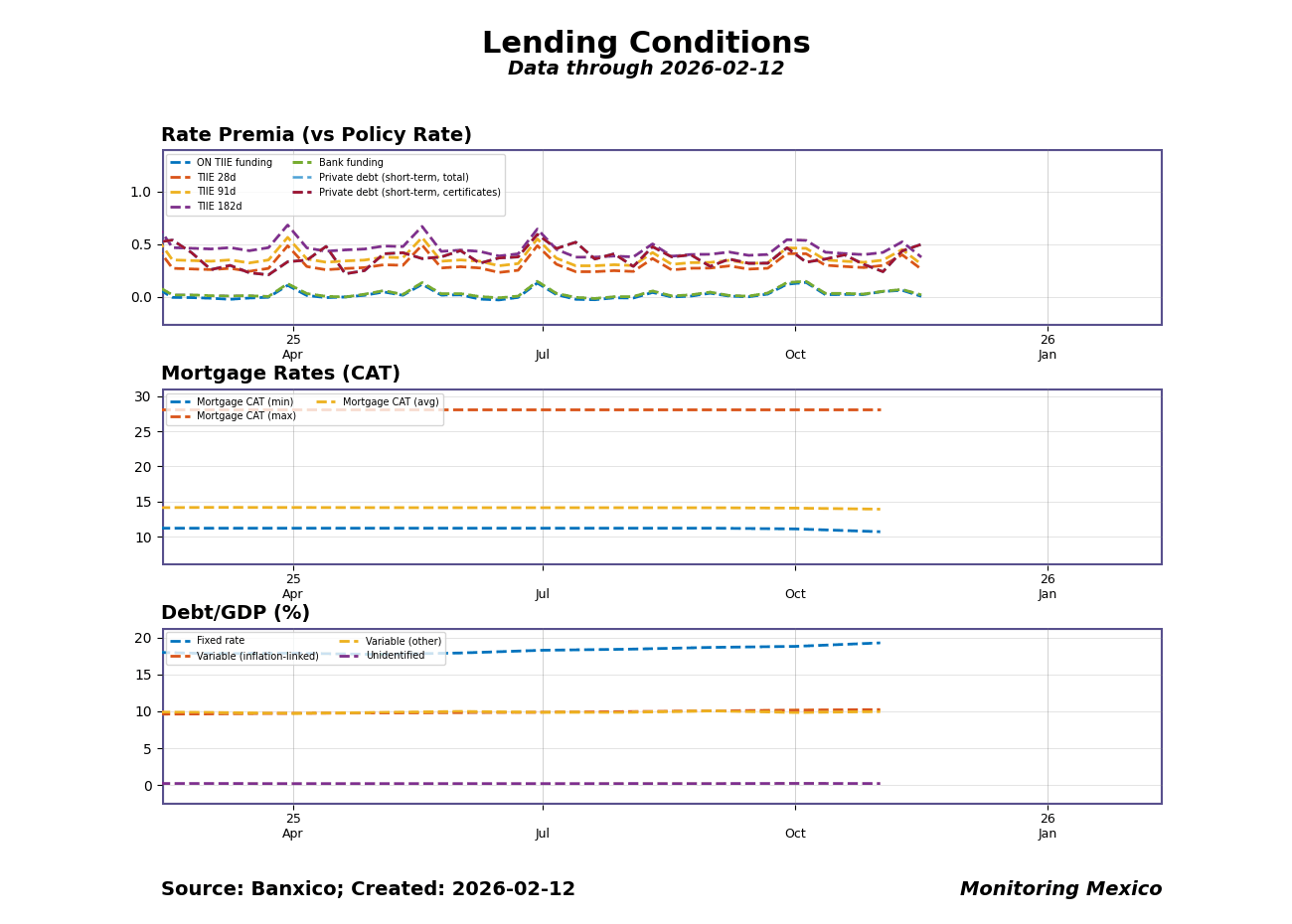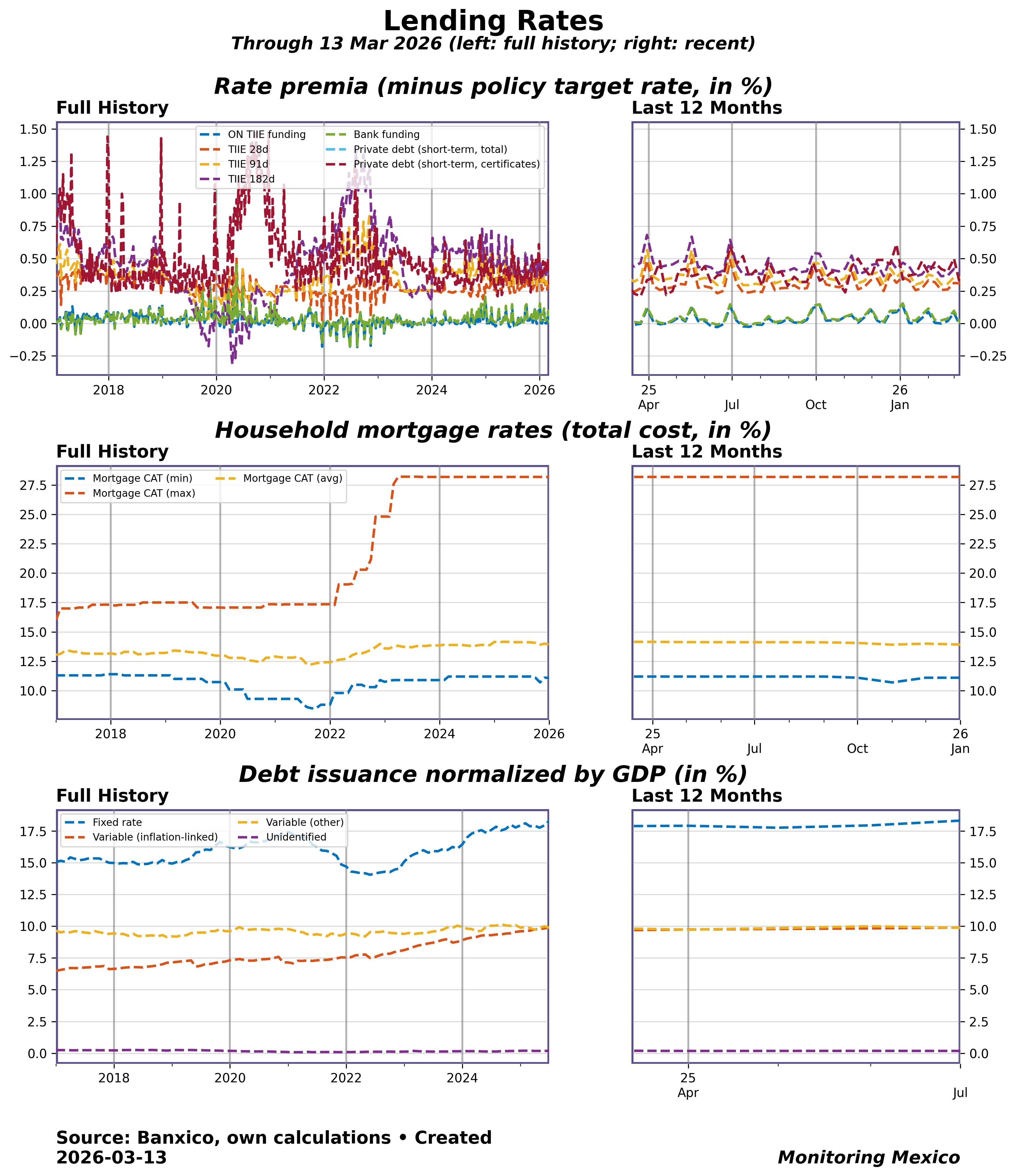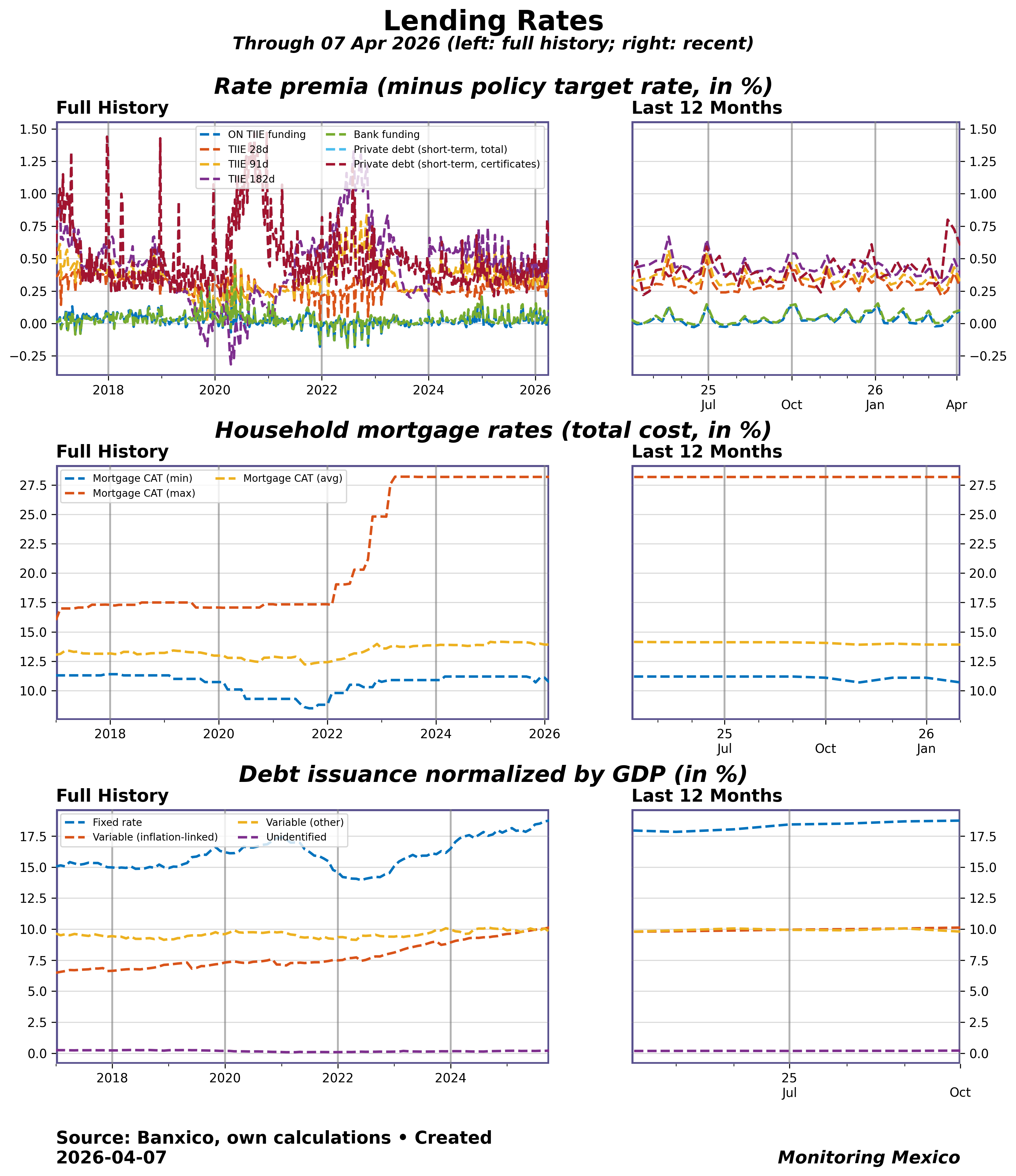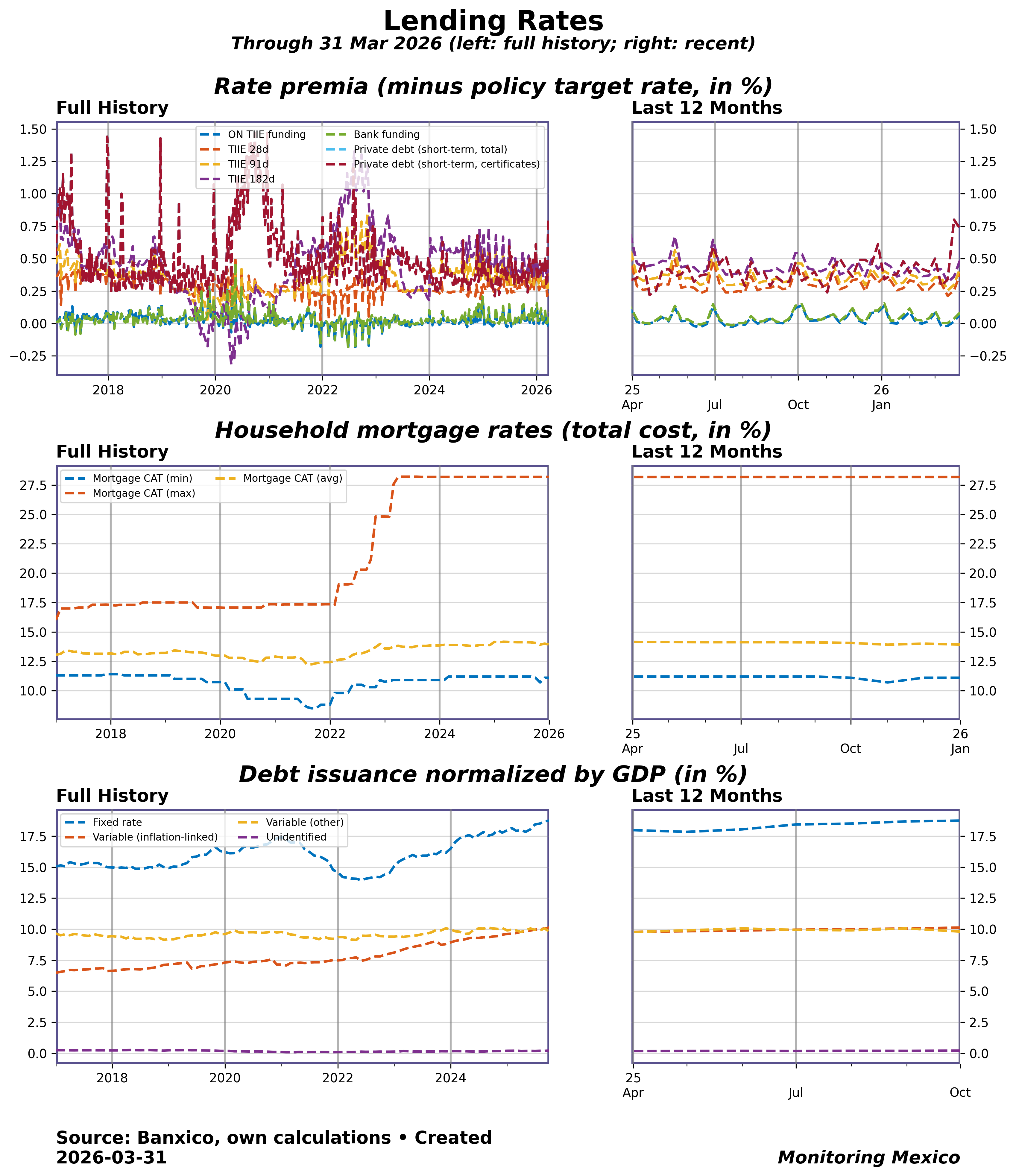 Rate premia show how market and bank funding costs move relative to the policy rate, indicating the efficiency of monetary transmission. Household mortgage rates capture the cost of long-term borrowing — their sharp rise in recent years signals affordability pressures and distributional effects, as many families face double-digit costs. Debt issuance patterns, normalized by GDP, reveal how firms finance themselves; the balance between fixed and variable rates matters for vulnerability to policy shifts. Together, these indicators show how policy rates filter into real borrowing conditions, affecting credit demand, investment, and ultimately growth and inflation dynamics.