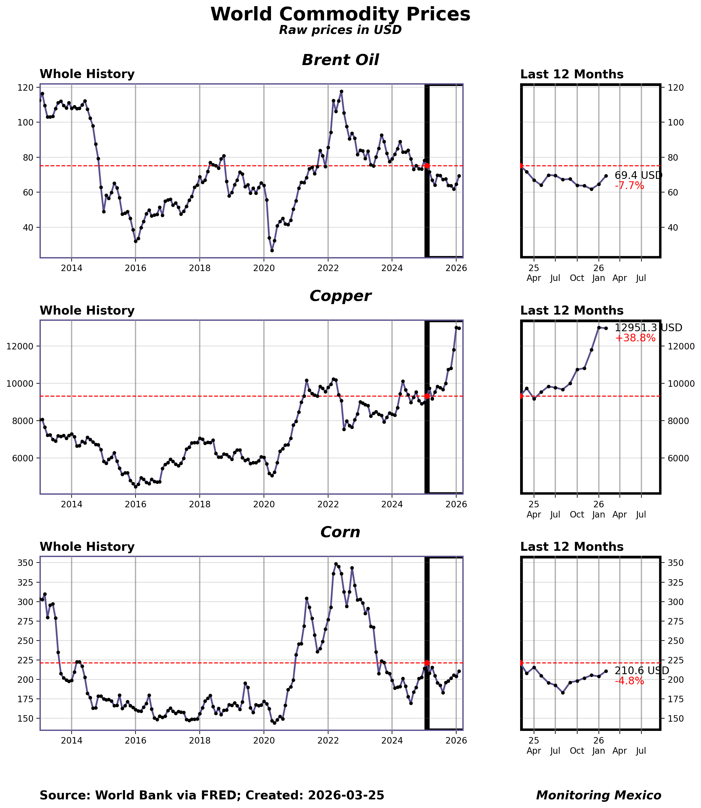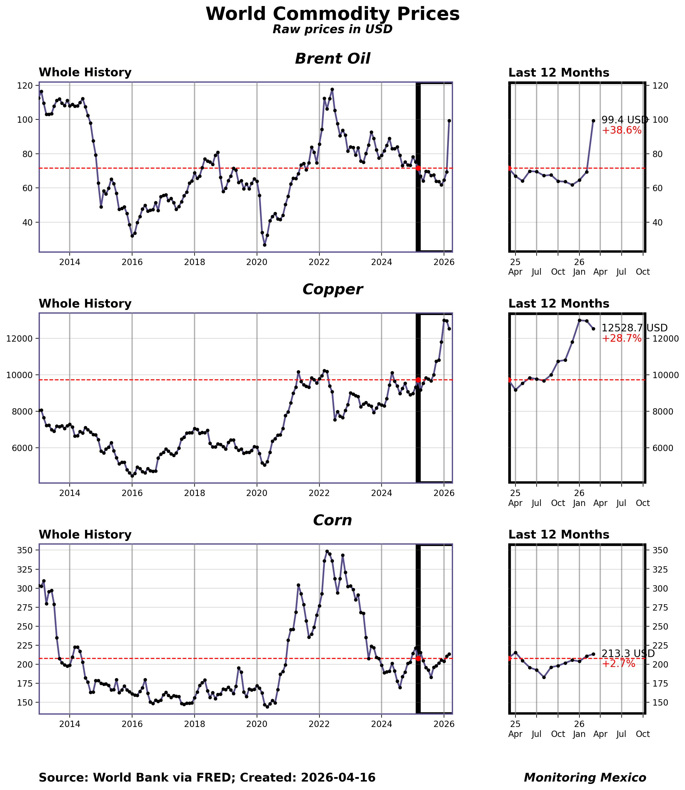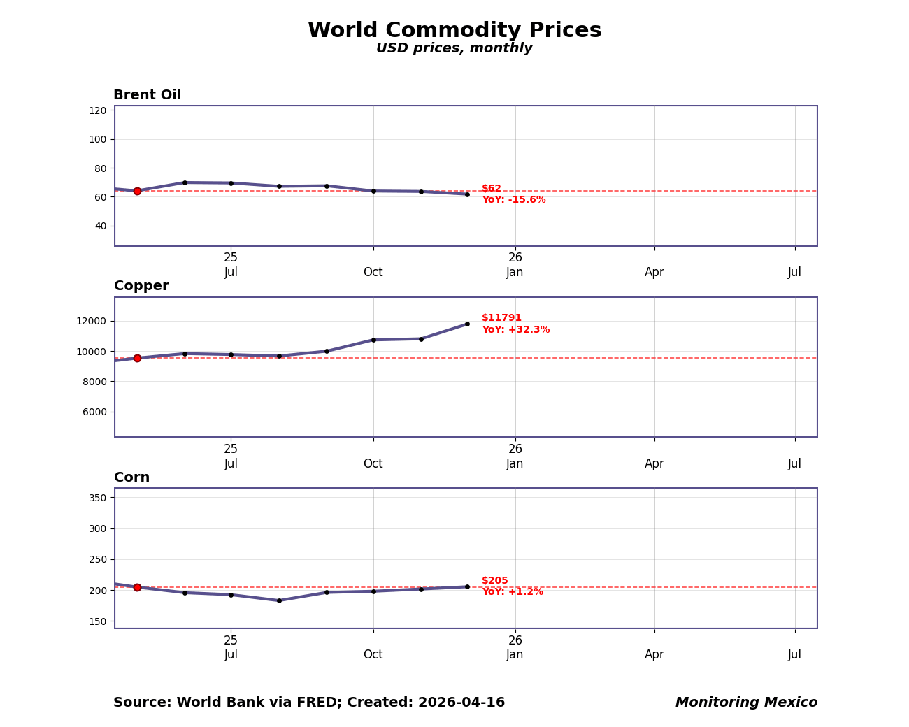 Commodity prices feed directly into Mexico's inflation pulse and terms of trade. Oil and corn affect energy and food costs, while copper is a proxy for global industrial demand. For policymakers, sharp commodity swings can shift inflation expectations and fiscal balances, making these prices critical to monitor.