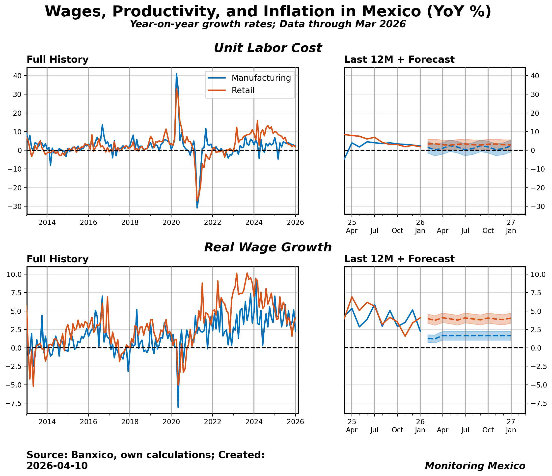 The March 2026 IMSS release shows unit labor costs at 2.27%, reflecting a rising trend as wages outpace productivity. Following March's formal sector wage data, ULC in manufacturing is rising, indicating that wage growth is exceeding productivity gains. At 2.27%, this figure resides in the 62nd percentile, having decreased by 0.49 from the previous month. This persistent upward pressure on unit labor costs suggests potential cost-push inflationary risks that could affect overall competitiveness in the manufacturing sector.