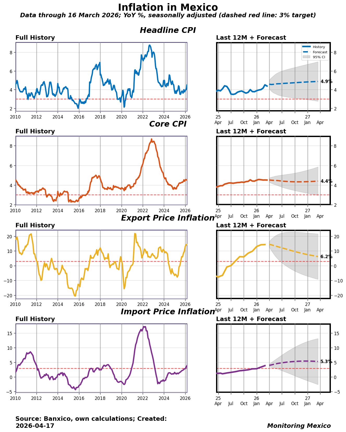 The mid-April 2026 CPI release shows headline inflation at 4.38%, placing it in the 58th percentile and above Banxico's target band of 2%-4%. The mid-April 2026 CPI release shows headline inflation at 4.38%, placing it in the 58th percentile and above Banxico's target band of 2%-4%. This marks a slight decrease of 0.13% from the previous month’s rate, indicating that inflationary pressures may be easing just a tad. However, with the current rate still significantly above the target, it underscores the ongoing challenge for policymakers as they navigate a landscape of stubborn inflation.