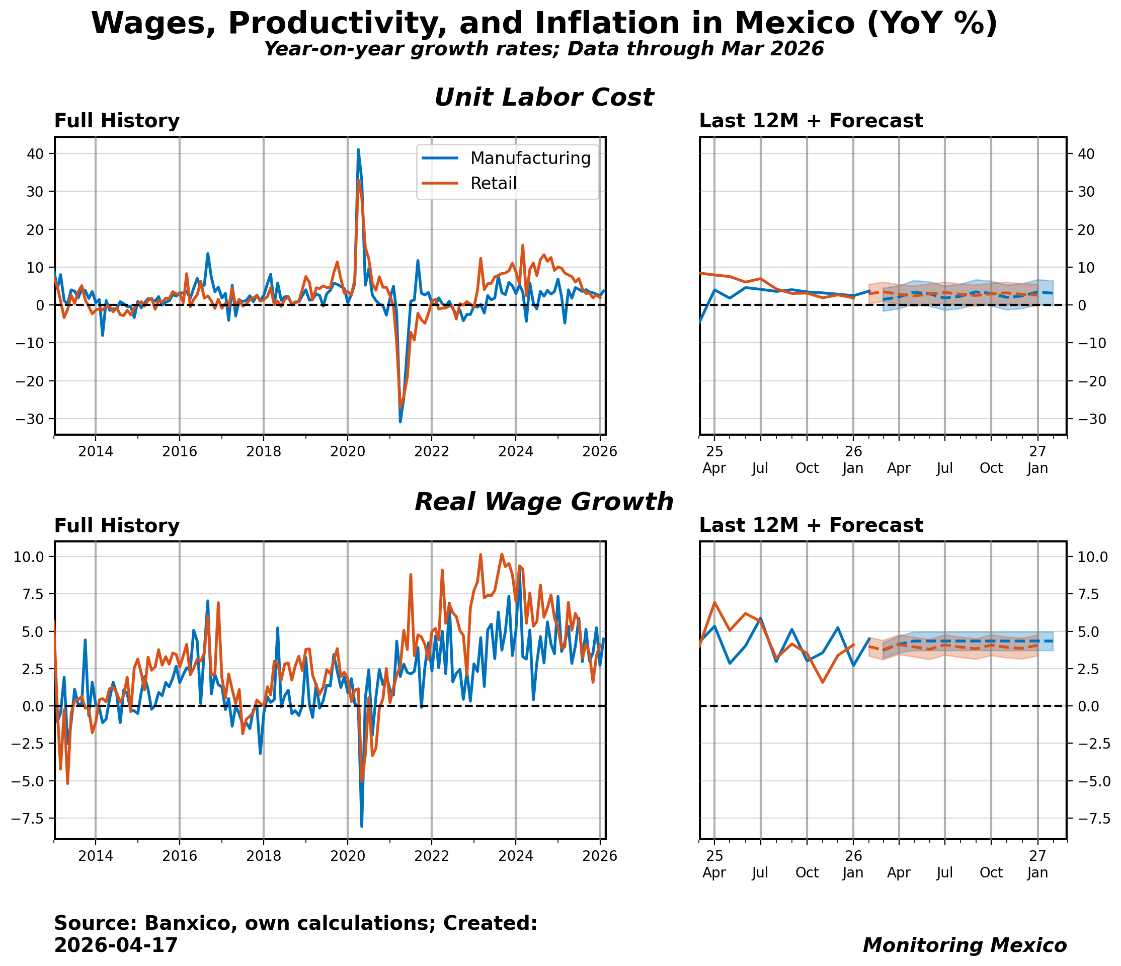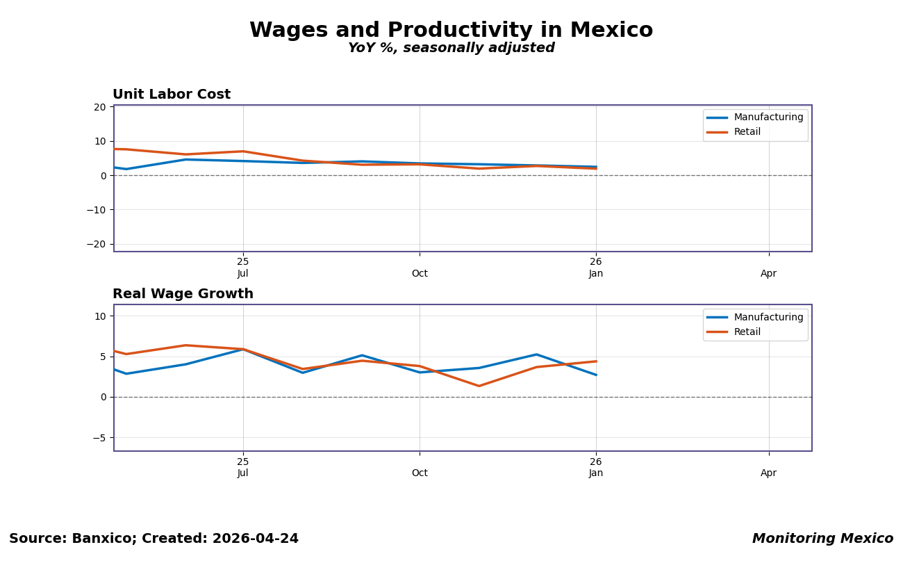 The February 2026 IMSS release shows unit labor costs at 3.66%, reflecting rising pressures as wages outpace productivity. Following February's formal sector wage data, ULC in manufacturing is rising, indicating that wages are growing faster than productivity. This latest reading is notable as it sits in the 80th percentile, having increased by 1.23 since the previous month. The implications are significant: this trend may signal potential cost-push inflation pressures that could squeeze margins and challenge competitiveness in the sector.