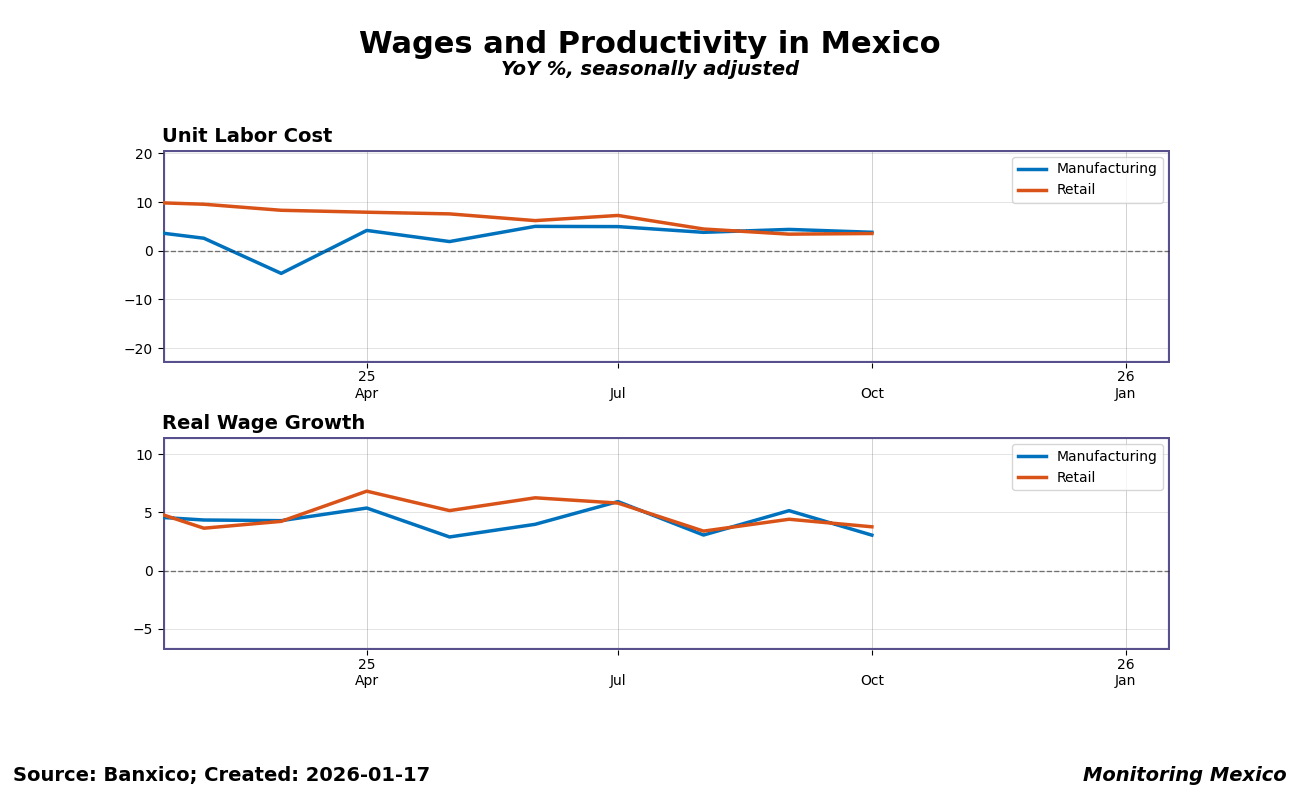 Unit labor costs (ULC) measure the average cost of labor per unit of output — when wages grow faster than productivity, ULC rises, potentially squeezing profit margins and fueling inflation. In Mexico, where the formal sector employs roughly half the workforce, IMSS-registered wage data captures trends in the formal economy but misses the informal sector's dynamics. Real wages — nominal wages adjusted for inflation — determine household purchasing power and underpin consumer demand. For policymakers, these indicators help balance inflation control, competitiveness, and the economic welfare of Mexican workers.