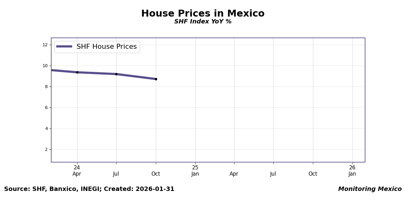 Housing is a major household asset and a key store of wealth. Rising prices can lift balance sheets and collateral values, while falling prices can weaken credit conditions and confidence. Housing costs also shape the cost of living and affordability, making house price inflation relevant for both growth and distributional pressures in Mexico.