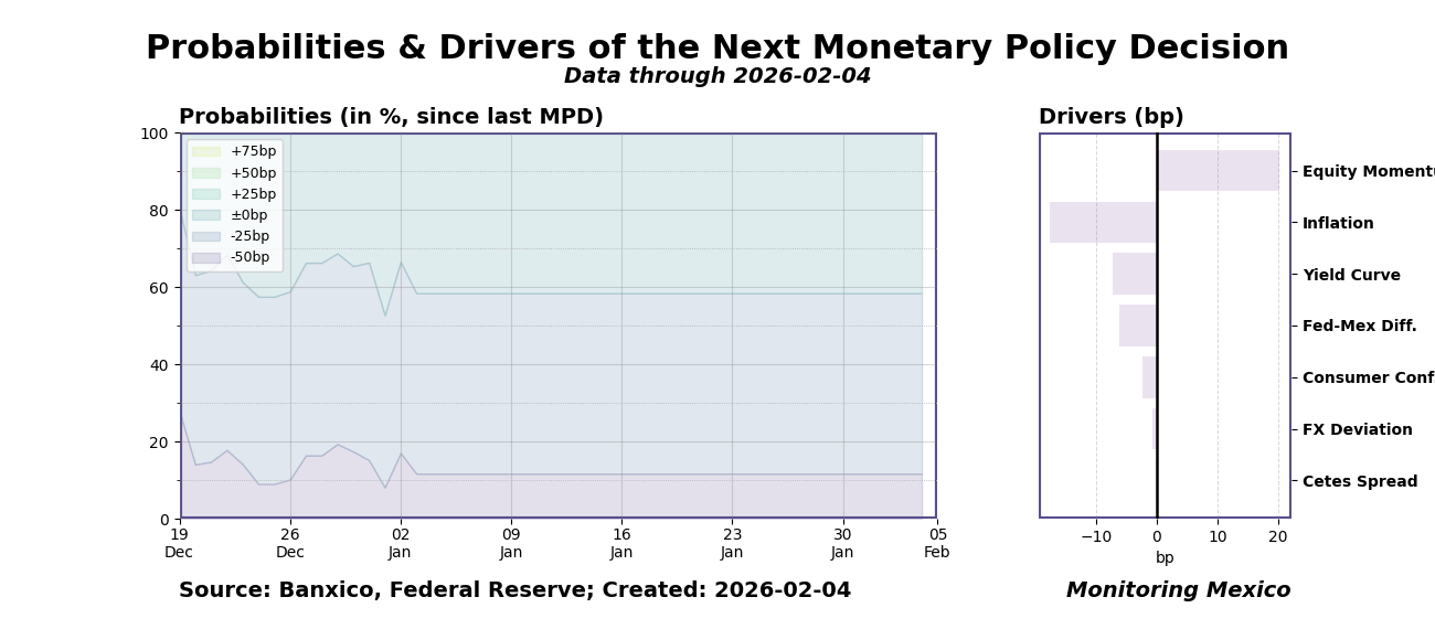 The interplay of various economic drivers continues to shape the policy landscape, with notable influences emerging from recent events. The model indicates slight dovish pressure stemming from stable inflation and positive developments in the exchange rate. Conversely, the ongoing geopolitical tensions, particularly related to U.S. sanctions affecting Mexico’s oil exports, exert moderate hawkish pressure. Policy uncertainty remains a significant factor, particularly as it relates to trade agreements and regulatory changes impacting key sectors like fuel distribution. Ultimately, the decision will hinge on the committee's judgment, considering that these driver influences are only part of the broader economic context.