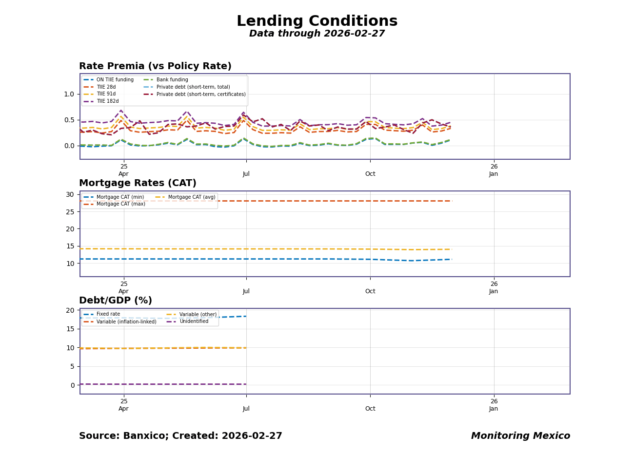 Banxico's March 2026 credit release shows money market spreads tightening amid shifting economic conditions. Following the latest March lending data, rate premia reflect a narrowing trend, with TIIE spreads now at 0.35% for the 28-day rate and 0.39% for the 91-day rate, both indicating a modest deceleration in funding costs. The latest revision has seen the bank funding rate adjust down to 0.04%, reinforcing the overall tightening dynamic. This tightening is significant as it suggests a more cautious lending environment, likely influenced by uncertainties in economic policy and inflationary pressures.