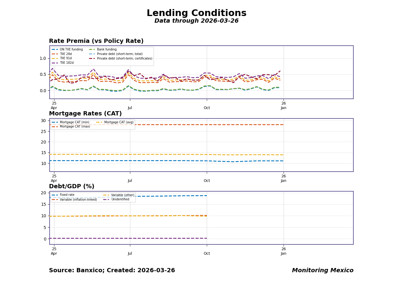 Banxico's March 2026 credit release shows money market spreads tightening, signaling a cautious lending environment. Following the latest March lending data, rate premia reveal that funding and TIIE spreads are currently at 0.27% and 0.31%, respectively, against a backdrop of a policy rate held steady. The spread has narrowed by 0.207% in the latest month, indicating a tightening trend that suggests lenders are becoming more cautious in their risk assessments. This shift carries implications for borrowing costs and overall credit availability, particularly for the non-financial private sector.