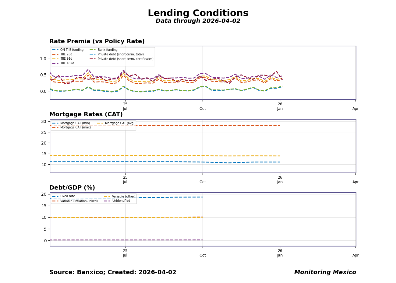 Banxico's April 2026 credit release shows money market spreads tightening, reflecting shifts in monetary conditions. Following the latest April lending data, rate premia reflect a narrowing trend, with money market spreads positioned at 0.10% for both bank funding and ON TIIE. The spread has contracted by 0.183% compared to the previous month, indicating a modest deceleration in funding costs. This tightening may signal a cautious market response amidst ongoing economic uncertainties, suggesting that while liquidity remains accessible, the environment is becoming increasingly selective as policymakers weigh inflationary pressures against growth prospects.